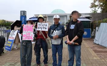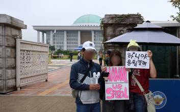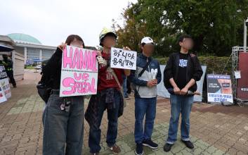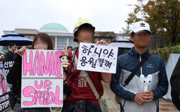 뉴진스 하니가 국회 환경노동위원회(환노위) 국정감사 참고인 출석을 앞둔 가운데 15일 오전 서울 여의도 국회 앞에서 하니를 응원하기 위해 팬들이 피켓 시위를 하고 있다.